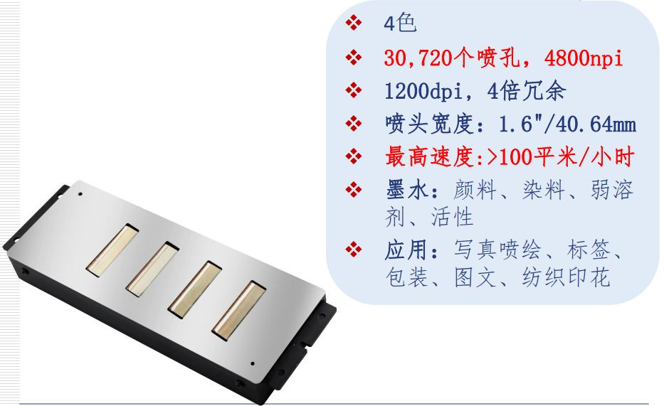 SUREjet-T7680工业级热发泡喷墨打印头是基于公司自主完成的多项授权发明专利技术研发而成。独特的4800npi超高密度多重冗余喷孔设计可以实现比现有技术更高的打印速度和图像均匀性,并具有更长的喷头寿命。打印速度是同类产品的4倍,单pass打印均匀性超过同类产品4 pass打印均匀性,寿命是同类产品的10倍以上。SURE-Stitch端对端无缝拼接技术可以根据应用需求灵活地集成不同宽度的定制化喷头,SURE-Temp恒温控制技术保证打印机在不同环境条件下实现不同打印速度和不同覆盖率图案的均匀打印。根据客户需求,公司还可以提供完整打印引擎,包括喷头、配套驱动板、供墨系统和打印软件。